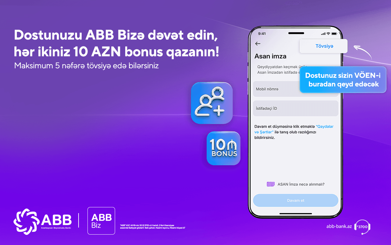 - Bonus məbləğinin Sizə və dostunuza köçürülməsi üçün 1 may 2025-ci il tarixinədək hər birinizin ABB Biz-də hesab açmağı lazımdır.