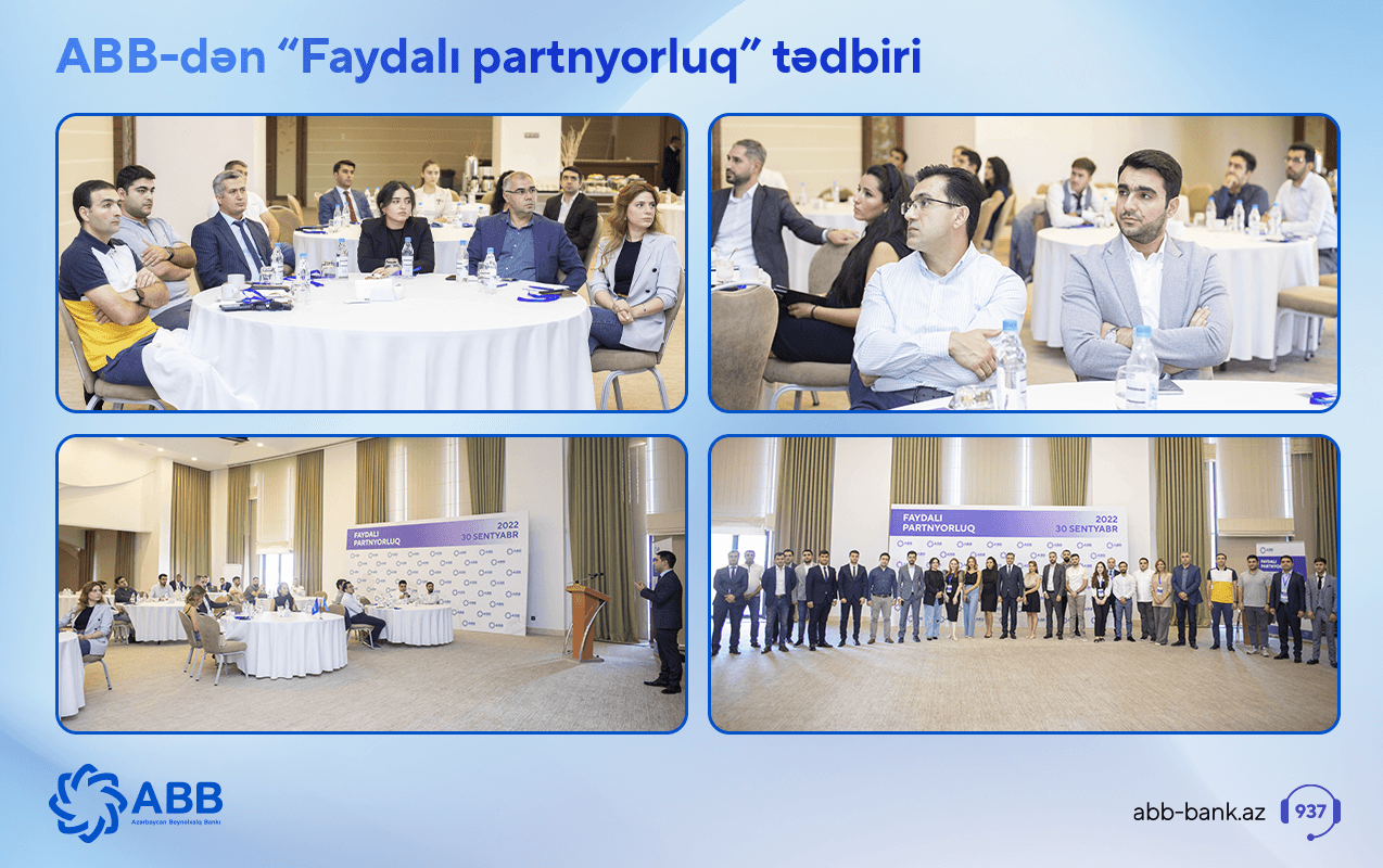 ABB özünün partnyorlar şəbəkəsinə daxil olan biznes qurumlarının təmsilçiləri üçün tədbir keçirib. ABB-nin Partnyorlarla iş departamentinin əməkdaşları iştirakçılara ekvayrinq, Bankın “Fayda” loyallıq proqramı, elektron ticarətin üstünlükləri barədə ətraflı məlumat veriblər. İştirakçıların sualları cavablandırılıb. Gündəlik fəaliyyətdə qarşıya çıxan məsələlərə diqqət yönəlib. Problemlərin həlli üçün təkliflər irəli sürülüb.