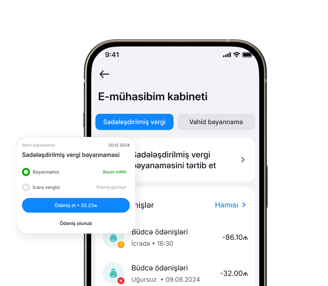 E-mühasibim ilə sadələşdirilmiş vergi bəyannaməsini və vahid vergi bəyannaməsini onlayn ödəyin.