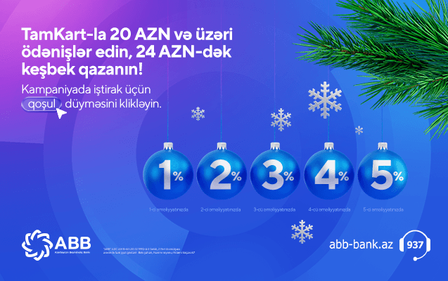 📅 15.12.2023 - 04.01.2024 (qeyd olunan tarixlər daxil) tarixlərində TamKart-la edilən hər növbəti əməliyyat sizə daha çox keşbek qazandıracaq!