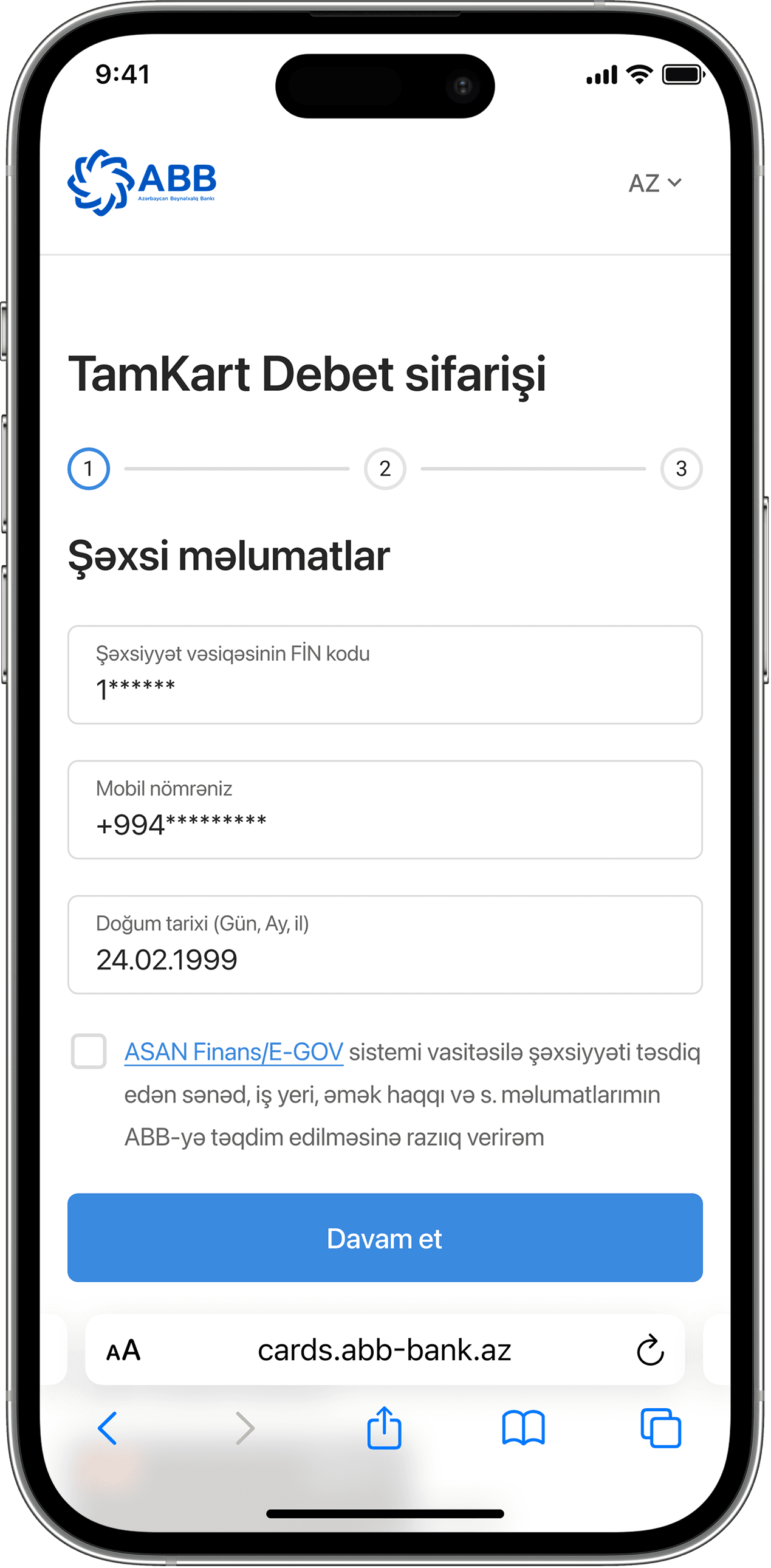 Kart sifarişi üçün şəxsi məlumatlarınızı daxil edin.