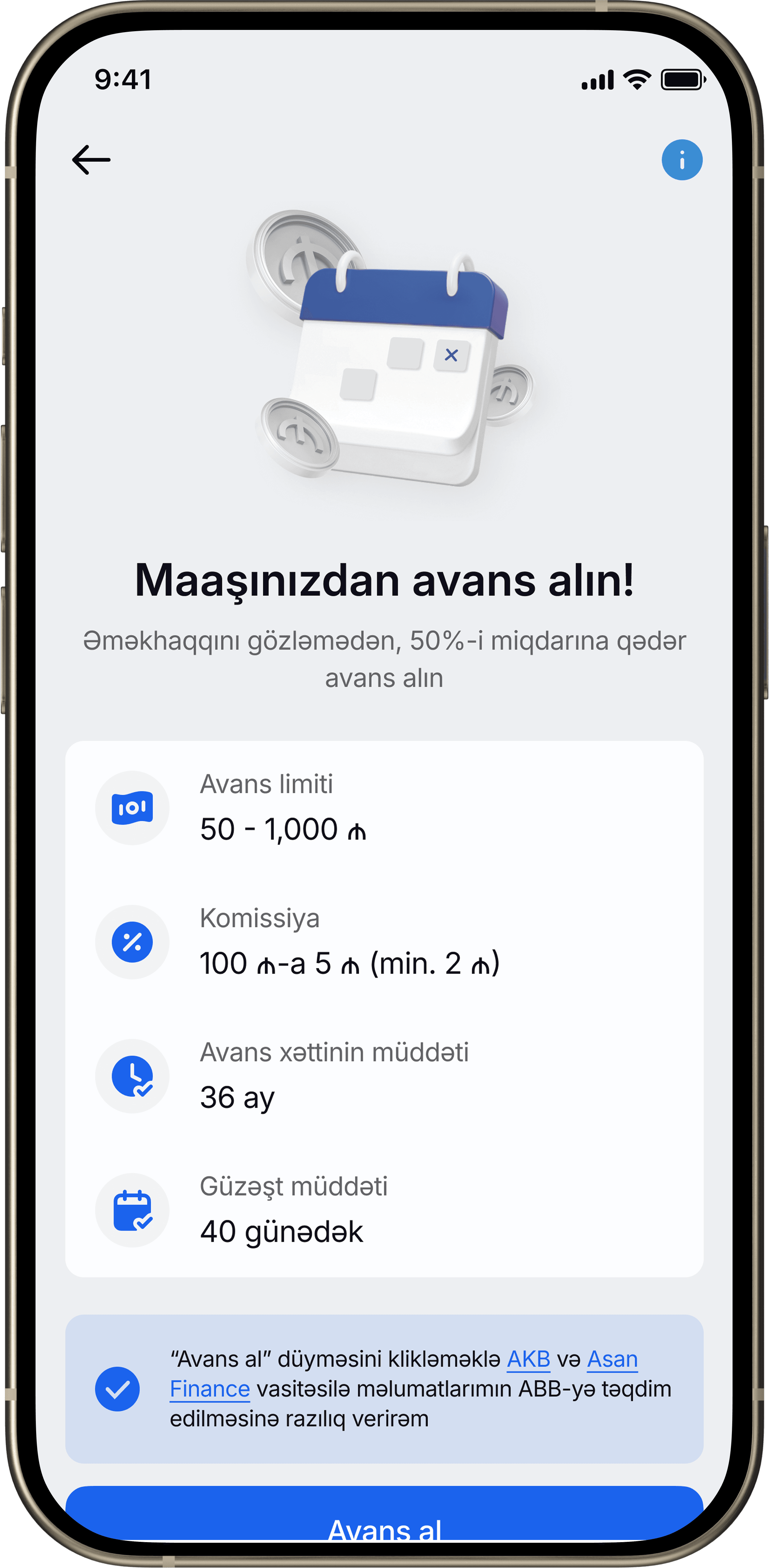 Avans kredit xətti ABB-dən əməkhaqqı və ya təqaüd alan şəxslərə maaşı gözləmədən təcili xərclərinin həlli üçün təklif olunan pul vəsaitidir.
