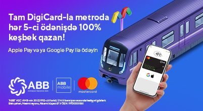 Bakı Metropolitenindən istifadə üçün ödənişi ABB-nin Tam Digicard ilə Google Pay və ya Apple Pay vasitəsilə icra edin, 5-ci gediş məbləğinin 100 %-ni keşbek olaraq qazanın!