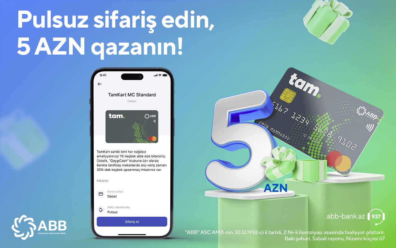 25.07.2023-cü il (25 iyul da daxil) tarixinədək ilk TamKart MasterCard Standard debet kartını ABB mobile tətbiqi üzərindən sifariş edən hər kəs 5 AZN hədiyyə qazanacaq!