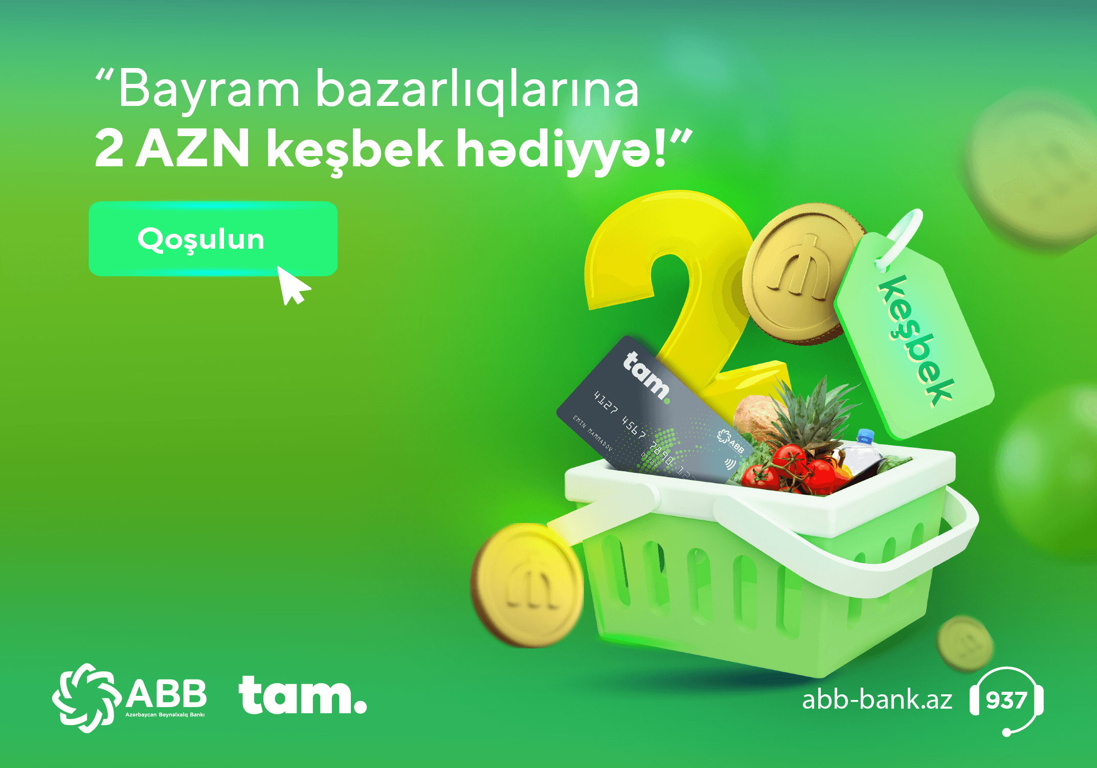 26-30 iyun tarixlərində TamKart debet və kredit kartları ilə market alış-verişlərinizdə edəcəyiniz hər 30 AZN və üzəri ödənişə 2 AZN keşbek qazanacaqsınız.