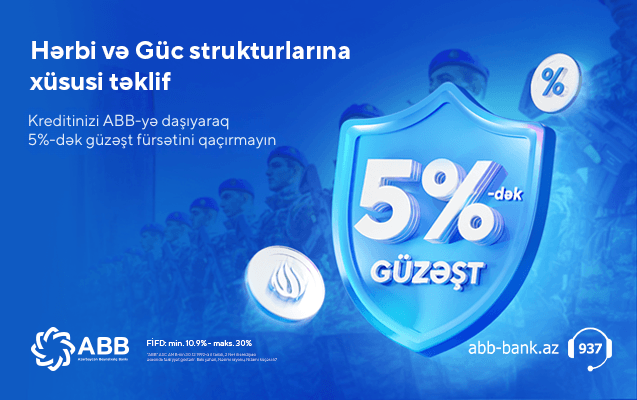 Azərbaycan Respublikası Silahlı Qüvvələri Günü münasibəti ilə 12-27 İyun tarixlərində hərbi və güc struktuları əməkdaşları istənilən bankda olan aktiv kreditini ABB-yə daşıyaraq, 5%-dək güzəşt əldə edə bilər.