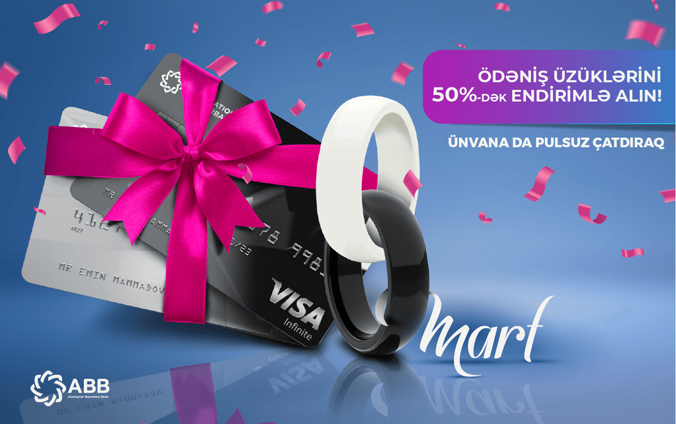 ABB 8 Mart Beynəlxalq Qadınlar Günü münasibətilə xanımlara xoş bir sürpriz hazırlayıb. Bu gündən başlayaraq Bank ödəniş üzüklərində endirim kampaniyasına start verir. Martın 10-a qədər davam edəcək kampaniya dövründə müştərilərə VISA İnfinite kartları ilə təqdim olunan ödəniş üzüklərini 50%, VISA Platinum kartları ilə təqdim olunan ödəniş üzüklərini isə 30% endirimlə əldə etmək olar. Üstəlik, onlayn sifariş edilmiş üzük və kartlar şəhər daxilində müştərinin ünvanına pulsuz çatdırılacaq.